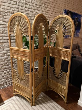 Elegante biombo de bambú trenzado con un diseño vintage. - Estructura de bambú y ratán. - Acabado en tonos beige y marrón. - Diseño trenzado artesanal. Las medidad indicadas es cerrado, Cada hoja es de 50 cm Depende de como lo abras puede llegar a medir 150 de maximo.