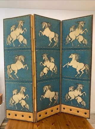 Elegante biombo de piel con un diseño de caballos. - Diseño de caballos en cada panel. - Acabado en piel. - Biombo de tres paneles.