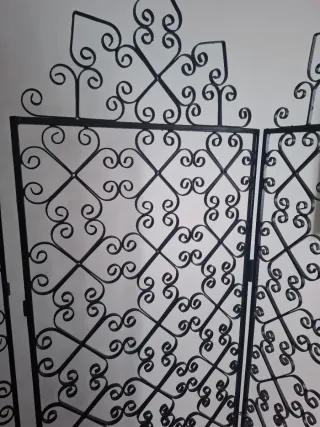 Elegante biombo de hierro forjado con un diseño clásico y decorativo. Ideal para separar ambientes con estilo. - Estructura de metal. - Paneles con celosía. - Acabado en negro y plata.