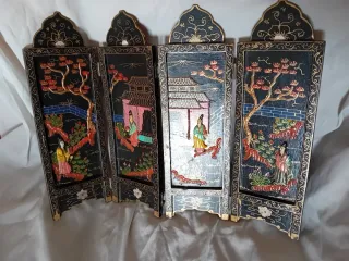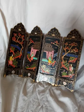 Pequeño biombo decorativo de estilo oriental, con un diseño vintage. - Cuatro paneles unidos por bisagras. - Figuras talladas y pintadas a mano. - Motivos dorados sobre fondo negro. una de las bisagras tiene que atornillarse