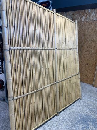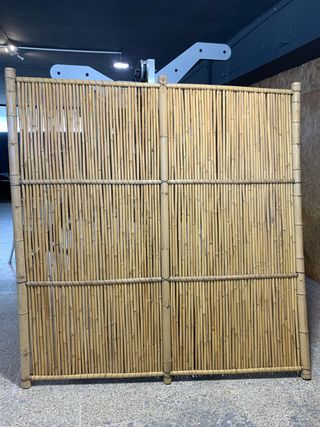 Biombo decorativo hecho de cañas naturales, ideal para separar ambientes o como elemento decorativo. - Estructura de cañas verticales. - Dos travesaños horizontales para mayor sujeción. - Montado sobre postes verticales de caña.