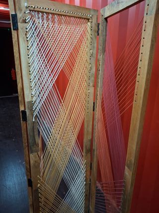 Biombo decorativo de madera con diseño de cuerdas entrelazadas. Medidas 1,85x0,50 cada lama - Estructura de madera. - Diseño de cuerdas en varios tonos.