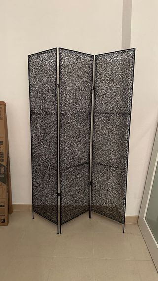 Elegante biombo de 3 paneles con un diseño translúcido en color negro. Ideal para separar ambientes o añadir un toque decorativo. - Estructura metálica. - Diseño calado. - Plegable para fácil almacenamiento.