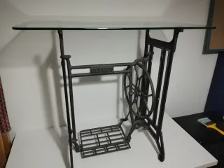 Mesa con base de hierro fundido y tapa de cristal. - Base de metal con diseño clásico. - Tapa de cristal. - Marca REFREY visible en la base.