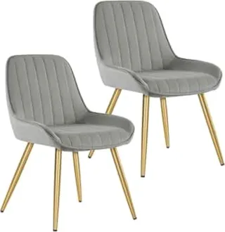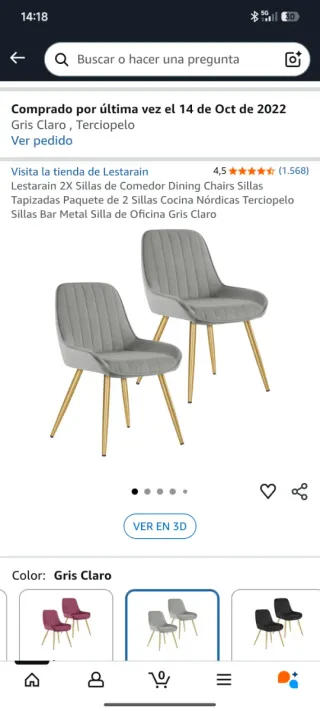 Set de 4 sillas de comedor con un diseño moderno y elegante. Son cómodas y aportan un toque de estilo a cualquier espacio. 40 euros por unidad están nuevas el precio en Amazon es de 73 - Tapizado en terciopelo gris. - Patas metálicas doradas.