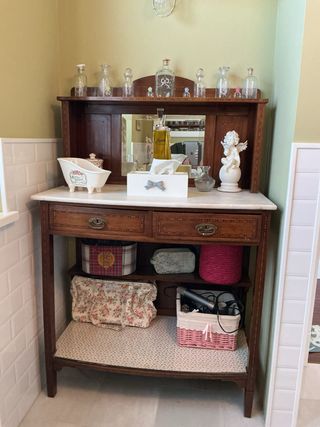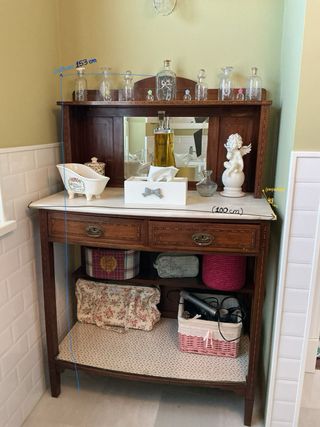 Mueble antiguo con encimera de mármol blanco y cristal en la parte inferior. Una joya vintage. Ideal para usarlo como botellero o en un baño. - Estructura de madera. - Diseño con 2 cajones y estante. - Encimera de mármol pulido.