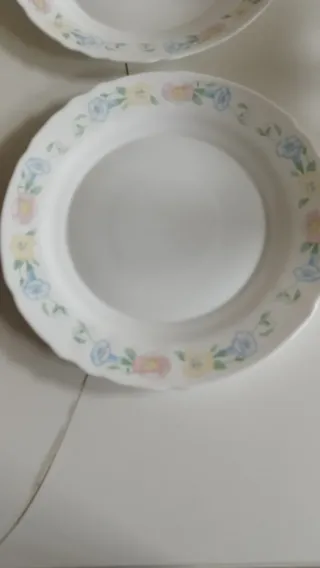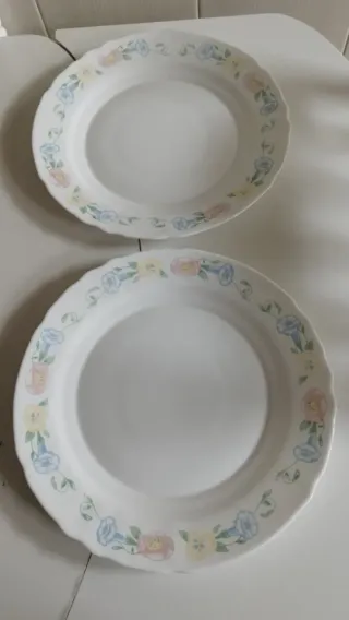 Conjunto de dos bandejas de Arcopal con un delicado diseño floral. Cada una 5 euros , llevando las dos por 9 euros - Diseño de flores en tonos pastel. - Borde ondulado.