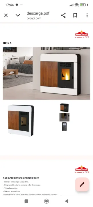 Estufa de pellets Bronpi modelo DORA, con un diseño moderno que combina madera y blanco. - Incluye tecnología Oasys Plus. - Programable: diario, semanal y fin de semana. - Tolva hermética. - Maneta de manos frías. - Posibilidad de salida de humos superior, lateral (izquierda) o trasera.