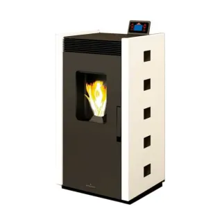 Estufa de pellets con un diseño moderno y elegante, ideal para calentar tu hogar. Cuenta con una ventana para ver la llama y un panel de control digital en la parte superior. - Acabado exterior en blanco y negro. - Ventana de cristal para visualización del fuego. - Panel de control digital. - Diseño contemporáneo.