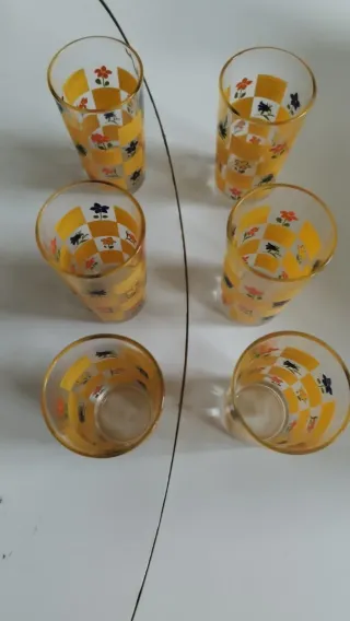 Conjunto de seis vasos con un diseño floral y a cuadros amarillos. Los seis por 6 euros - Diseño a cuadros amarillos. - Estampado de flores. - Vidrio transparente.