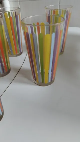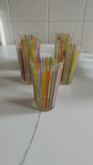 Conjunto de cinco vasos de cristal con un diseño alegre y colorido. Los 5 por 5 euros - Diseño de rayas verticales en múltiples colores. - Material de cristal transparente.