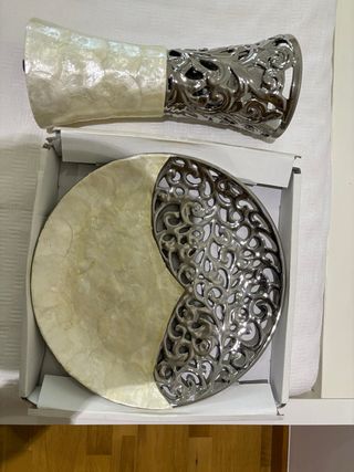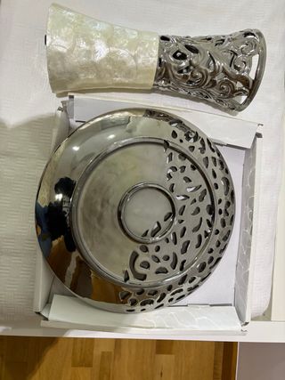 Conjunto decorativo de florero y plato. - Florero con base de nacar y detalles metálicos. - Plato con diseño calado en metal.