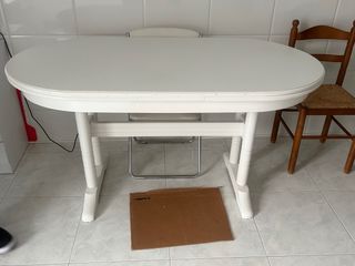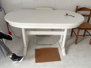 Mesa de cocina en madera blanca ovalada extensible con alguna marca. En muy buen estado a recoger en boiro calle bao. Regalo 4 sillas con la compra.