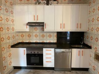 Conjunto de cocina con acabados en blanco y plateado. - Muebles de cocina blancos con tiradores naranjas - Encimera de granito negro. - Electrodomésticos integrados: horno, lavavajillas y campana extractora. - Azulejos con diseño floral en blanco y naranja.