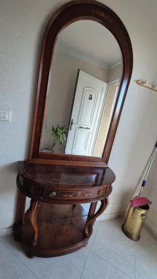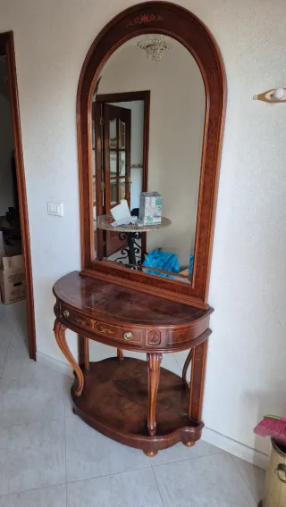 Elegante mueble de entrada con espejo en madera de muy buena calidad. - Acabado en madera con detalles dorados. - Superficie de cristal. - Diseño clásico y funcional.