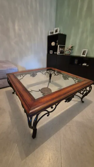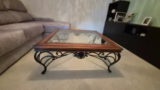 Elegante mesa de centro con un diseño clásico y robusto. Combina la calidez de la madera con la transparencia del cristal. - Marco de madera con acabado detallado. - Base de metal forjado con ornamentos. - Superficie de cristal templado.