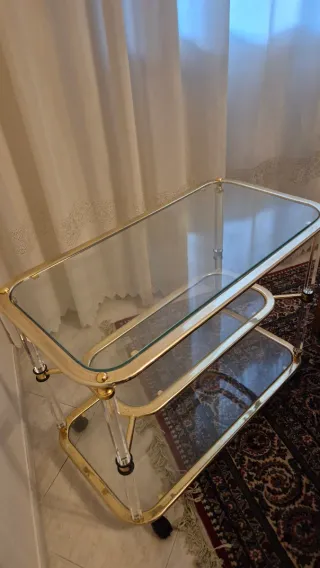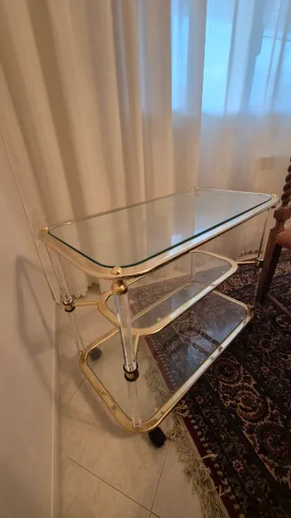 Elegante mueble bar de 3 niveles con un diseño moderno y sofisticado. - Estructura principal en metal dorado. - Superficies de cristal transparente. - Patas y detalles en acrílico. - Ruedas para fácil movilidad.