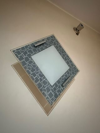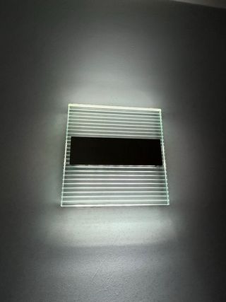 Elegante aplique de pared con un diseño moderno y geométrico. Combina a la perfección con cualquier estilo de decoración. - Marco exterior con patrón de cuadrados. - Difusor central de cristal. - Detalles metálicos.