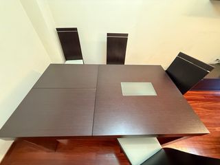 Conjunto de mesa de comedor con cuatro sillas a juego. El diseño moderno aporta un toque elegante a cualquier espacio. - Mesa de madera oscura y detalle central de cristal. - Sillas con asientos color crema y estructura de madera oscura. - Base de la mesa con acabado metálico. - Medidas 92x92cm cerrada y 92x160cm abierta.