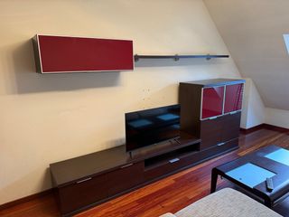 Conjunto de muebles para salón con un diseño moderno y elegante. - Acabado en tonos marrones y detalles en rojo. - Combinación de madera y cristal en su fabricación. - Se puede montar de diferentes formas. - Longitud total 300cm