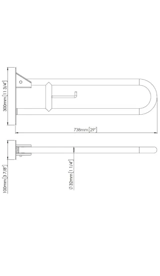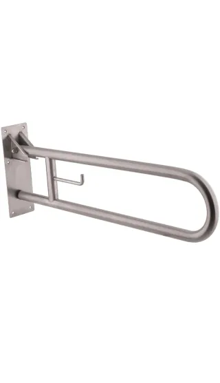 Barra de apoyo abatible diseñada para facilitar el acceso y la seguridad en el baño. - Fabricada en metal resistente. - Acabado plateado pulido. - Incluye un pequeño gancho para colgar. - Montaje a pared.