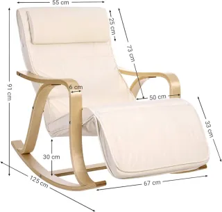 Mecedora cómoda y elegante, perfecta para relajarse. Su diseño combina a la perfección con cualquier estilo de decoración. - Estructura de madera curvada. - Cojines acolchados de tela. - Reposapiés integrado. - Medidas: 125 cm (largo) x 91 cm (alto) x 55 cm (ancho).