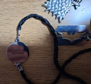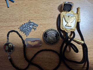 Lote de colgantes y accesorios. - Colgante de lobo de Juego de Tronos. - Colgante de Jack Skellington de Pesadilla antes de Navidad. - Moneda Semper Fidelis. - Collar de Batman - Corbata de bolo con águila.