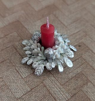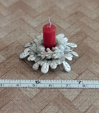 Adorno de mesa para Navidad en miniatura. - Vela roja central. - Decoración con hojas plateadas y bolas brillantes.