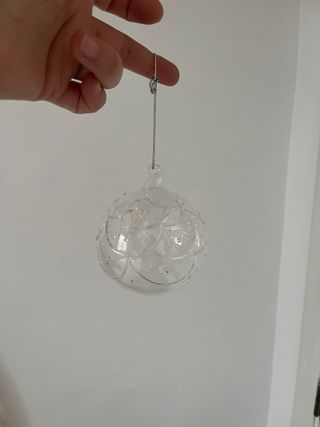 Adorno de Navidad con diseño de bola transparente, ideal para colgar. - Diseño con relieve de caras. - Material plástico.