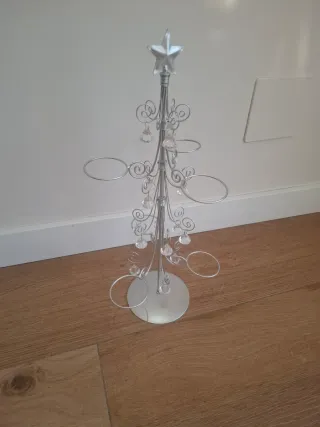 Este árbol de decoración navideña es un bonito detalle para estas fiestas. - Diseño elegante en forma de árbol. - Adornado con lágrimas tipo cristal (son de plástico pero preciosas y muy bien conseguidas) - Acabado metálico plateado. 6 arandelas para meter vasitos con velas o bien poner bolas de Navidad.