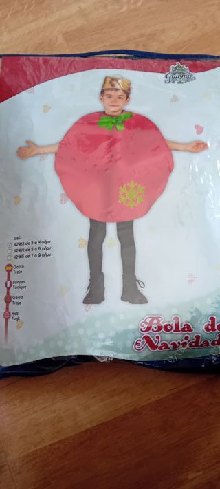 Disfraz de bola de Navidad para los más pequeños. Ideal para fiestas o eventos. - Talla 2-3 años. - Color verde con detalle de copo de nieve dorado. - Incluye pajarita roja y gorro dorado. Ideal. Un solo uso. Prácticamente sin desperfectos (el gorrito simula el enganche de la bola y al del dorado se ve un pelín de roce pero no se aprecia) Súper cómodo para el peque : va sobrepuesto y se quita fácilmente. Más cositas en mi perfil