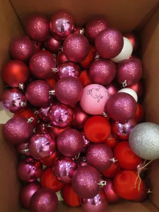 Lote de bolas navideñas en varios tonos de rosa y rojo,más de 70 bolas algunas con purpurina y otras lisas. Incluye bolas nuevas y usadas. Ay bolas blancas y gris nuevas que va con pilas y una caja que va también con batería se hace envío - Bolas de Navidad variadas. - Tonos rosas y rojos. - Acabados brillantes y mates.