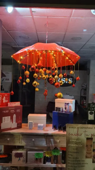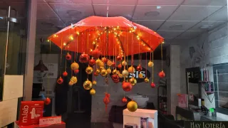Conjunto de adornos navideños para decorar tu hogar. - Bolas de diferentes tamaños. - Tonos dorados y rojos. - Bonito y original. - Hecho a mano. - Para colgar del techo. - IDEAL PARA ESCAPARATES, HOGAR... Incluye adornos y luces, tal como se ve. Ganador del tercer premio del concurso de escaparates del barrio, como se ve en foto.