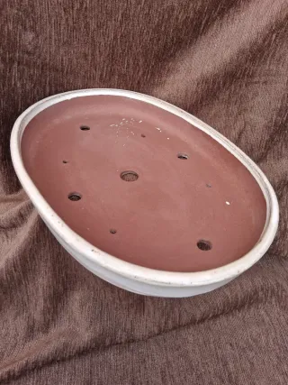 Gran maceta de cerámica de forma ovalada, ideal para bonsáis. Su diseño combina un interior en tono terracota con un borde exterior en blanco. - Material: Cerámica, Mide 41x29x5,5cm