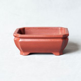 Maceta de cerámica en color rojo, ideal para bonsáis. - Diseño rectangular. - Base con pequeñas patas.