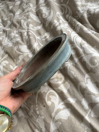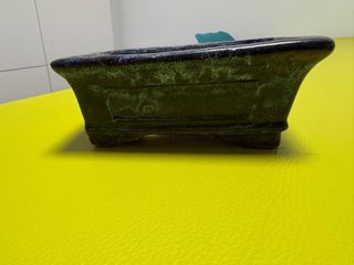 Pequeña maceta de cerámica con un acabado verde moteado, ideal para bonsáis. 14*11*4 - Diseño ovalado. - Patas integradas.