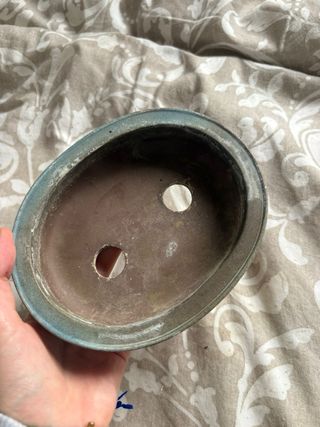 Maceta de estilo japonés, ideal para bonsáis. Su diseño ovalado y sus acabados le dan un toque único. - Materiales: Cerámica y terracota. - Tonos: Azul y marrón.