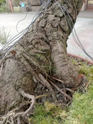 Precioso bonsái con más de 40 años de antigüedad y 50 cm de diámetro. Un ejemplar único con un tronco retorcido y raíces expuestas que le dan un carácter especial. - Tronco principal con forma espiral. - Raíces aéreas prominentes. - Maceta de bonsái rectangular.