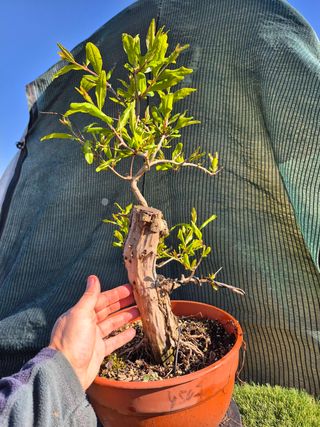Precioso granado en formato bonsái, con un tronco robusto y ramas jóvenes llenas de hojas verdes. - Tronco principal con textura marcada. - Hojas de color verde brillante. - Maceta de terracota incluida.