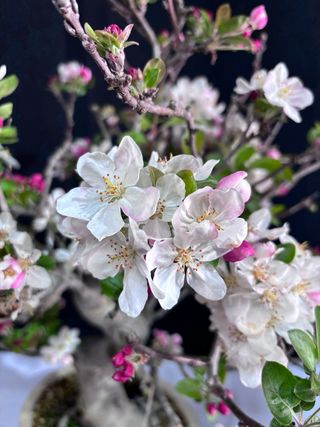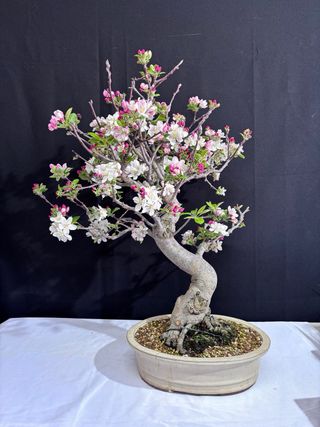 Precioso bonsái de manzano en plena floración. Tiene una base de 9cm y una altura de 33cm.