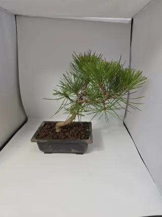 Precioso bonsái de pino negro japonés, con un tronco curvo y ramas bien definidas. - Ideal para coleccionistas y amantes de la jardinería. - Presentado en una maceta de bonsái rectangular.