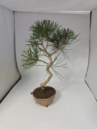 Precioso bonsái de pino negro japonés, con un tronco retorcido y ramas bien definidas. - Ideal para coleccionistas y amantes de la jardinería. - Presentado en una maceta de cerámica.