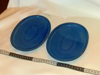 Par de platos para macetas de bonsái de cerámica. - Diseño ovalado. - Acabado esmaltado en azul