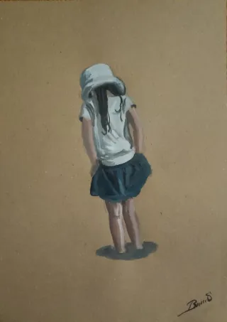 Pintura original de una niña en la playa, firmada por BizaroS. - Representación artística de una niña con sombrero y cesta. - Tonos naranjas y blancos predominantes en la vestimenta. Pintado a mano en acrílico Sus medidas son de 20x30 cm