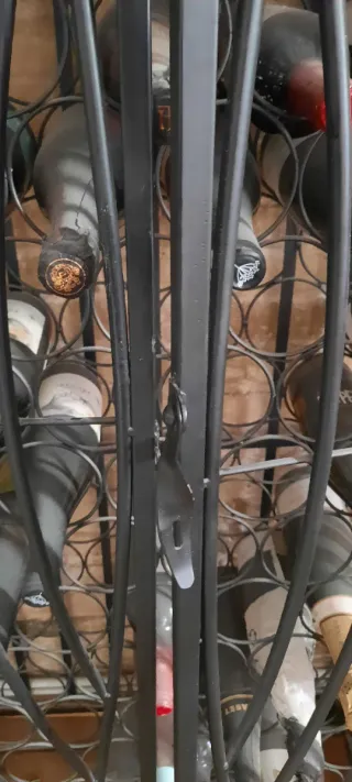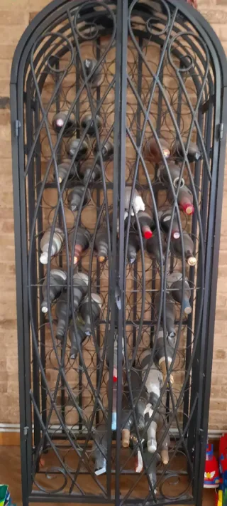 Botellero/ mueble para vino artesanal de forja y madera, una pieza única. Recuperado de una bodega donde tenían en exposicion los vinos clásicos. - Capacidad para 35 botellas tumbadas y estante de madera para copas o botellas en vertical. - Diseño artesanal con detalles ornamentales y posibilidad de cerrar con candado. - Combina metal y madera para un acabado elegante. - Tiene una pata un poco torcida, pero no afecta a la carga, la tenemos siempre llena. - Vendemos porque vamos a poner una vinoteca en este hueco de escalera y no tenemos otro espacio para ponerlo. 35 cms fondo * 55 cms ancho * 103 cms alto en lo más alto