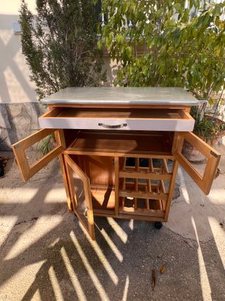 Carrito auxiliar de madera para cocina con espacio para botellas. Ideal para organizar tu cocina. Con ruedas. - Cajón superior. - Puertas de policarbonato. - Botellero integrado.