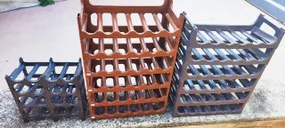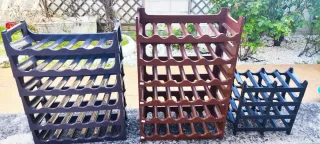 3 botelleros de plástico duro. Capacidad: - 2 botelleros para 36 botellas cada uno, 6 niveles con 6 botellas cada uno. - 1 botellero para 16 botellas, 4 niveles con 4 botellas cada uno. - Plástico duro muy resistente. - Para todo tipo de botellas. Cada botellero de 36 botellas cuesta 20 €. El botellero de 16 botellas, 10 €. Se pueden vender por separado. Si se compran los tres, el precio sería 45 €. No se hace envío. Recoger en casa.