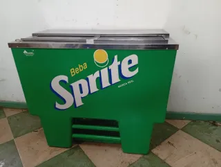Botellero refrigerador con diseño de Sprite. - Color verde brillante. - Tapa superior de acero inoxidable. - Rejilla frontal para ventilación.