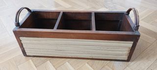 Pequeño mueble de almacenaje o macetero. Hecho con madera maciza y bambú. Ideal para un hall, cómo botellero, etc. Consta de 3 compartimentos de 13cm x 14cm, lo que le da versatilidad. Se traslada muy bien ya que dispone de dos asideros muy resistentes. Muy cuidado.