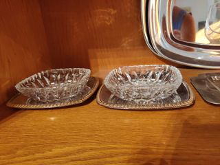 Bandejas color plata 3 Uds Cruz de Malta (25€), copa cognac cristal con bandeja, dos bandejas pequeñas de cristal con bandeja para snacks, botellero (no se incluye botella). Precio en función del interés de cada referencia. Más referencias de decoración en mi perfil por liquidación.